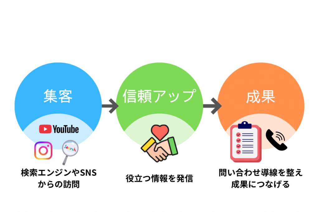 たとえば、検索エンジンやSNSからの訪問をきっかけに、役立つ情報発信でユーザーからの信頼を高めます。